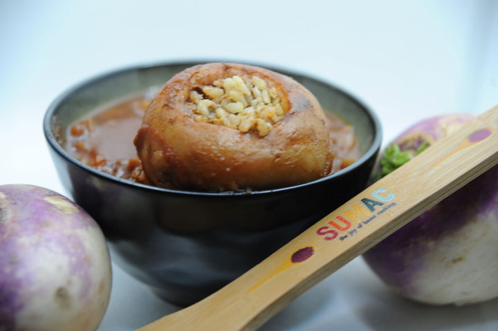 A delicious classical winter recipe from Palestine, Hebron specifically, tangy with tamarind & made lighter where we omitted deep frying pre-stuffed turnips.